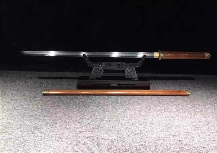 铜装百炼花纹钢酸枝木素装唐刀 全长:105cm 刃长:73cm 柄长:27.5cm 刃厚:0.7cm 刃宽:3.2cm 送锦盒剑油