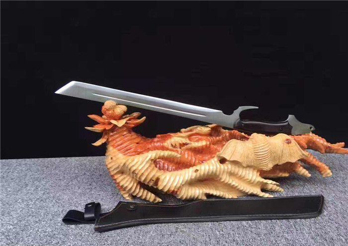 卡巴战刃 总长:60cm 刃长:40cm 柄长:20cm 刃宽:3.5cm 刃厚:0.5cm 刃材:高猛钢一体形 柄材:黑炭木 翘材:PU皮套 硬度:57HRC~60HRC 工艺:龙泉古法传统手工艺 送锦盒剑油
