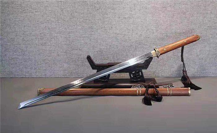 纯铜素装唐刀-花纹钢-纯铜装 全长:102cm 刃长:72cm 柄长:27cm 刃宽:3.2cm 刃背厚:0.7cm 刃材:百炼钢 装具:纯铜 鞘材:上等酸枝 赠品:锦盒 适合:收藏,情侣配送 乔迁送礼 武术健身 精美摆设