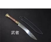 武者 全长:56.5cm 刃长:34.5cm 柄长:22cm 刃宽:4.5cm 厚度:0.6cm 刃材:高锰钢 鞘材:皮套 装具:合金 净重:0.85kg 工艺:古法锻造 千锤百炼,十五道手工研磨送锦盒剑油