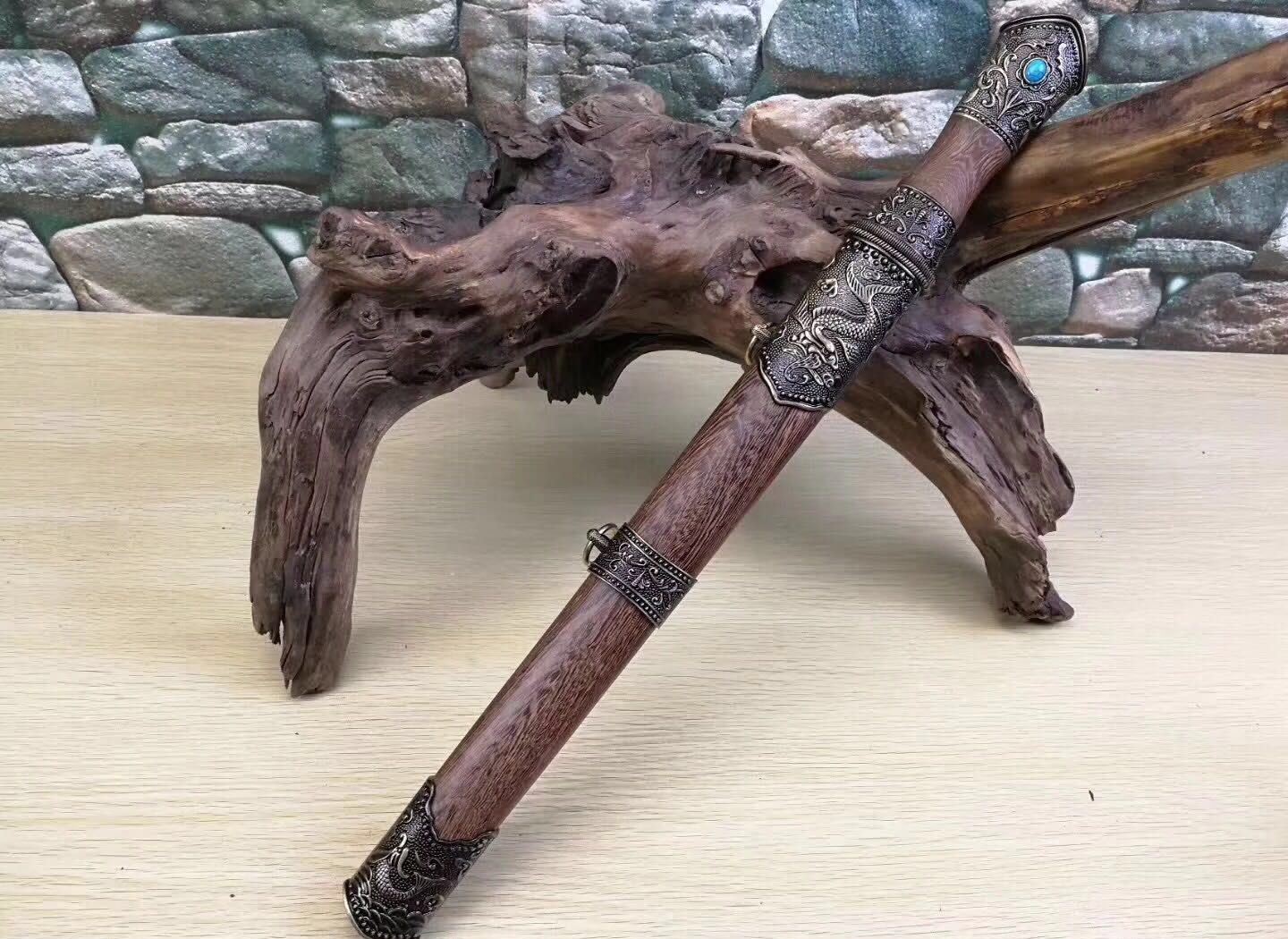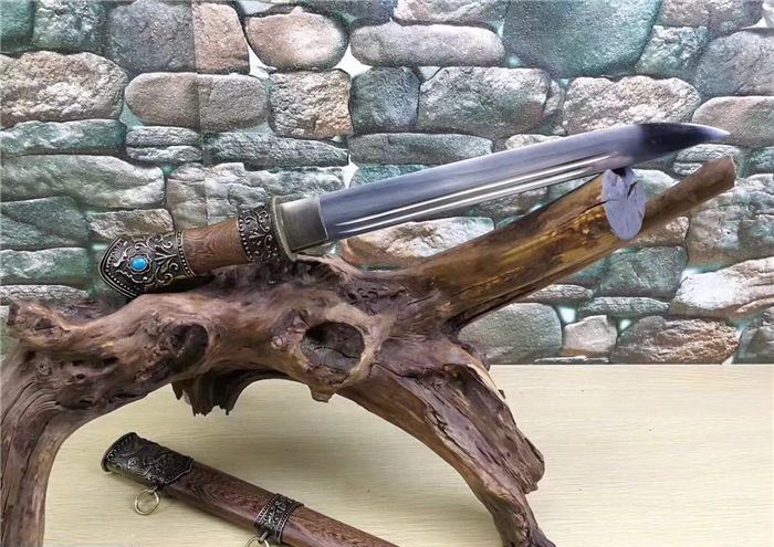 精品特价藏刀 全长:49cm 刃长:31.5cm 炳长:13cm 刃宽:3cm 刃厚:0.7cm 材质:百炼钢 刀鞘:鸡翅木 装具:合金 工艺:手工锻打 赠品:高档锦盒剑油