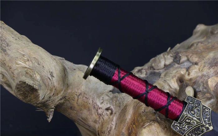 百炼钢手工折叠锻打,仿古装具睚眦纹饰,乌木鞘深邃大气。