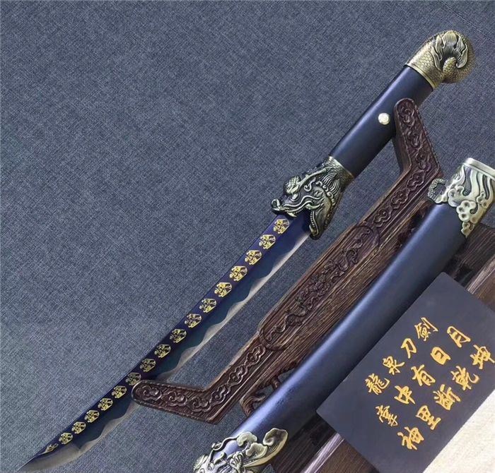 乌木刀鞘、青古合金配件、刀身;高锰钢烙花烤蓝鎏金、韧口硬度在60左右。