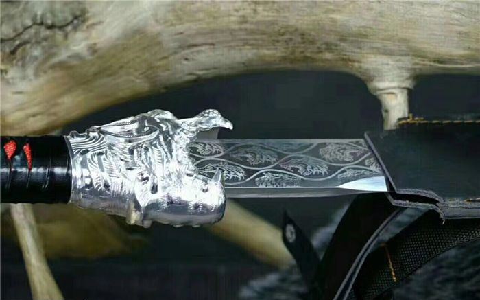 20寸高锰钢腐蚀雕刻雪豹纹。高锰钢手工淬油锻打,镀银装具雪豹纹饰,高档肩背牛皮套。