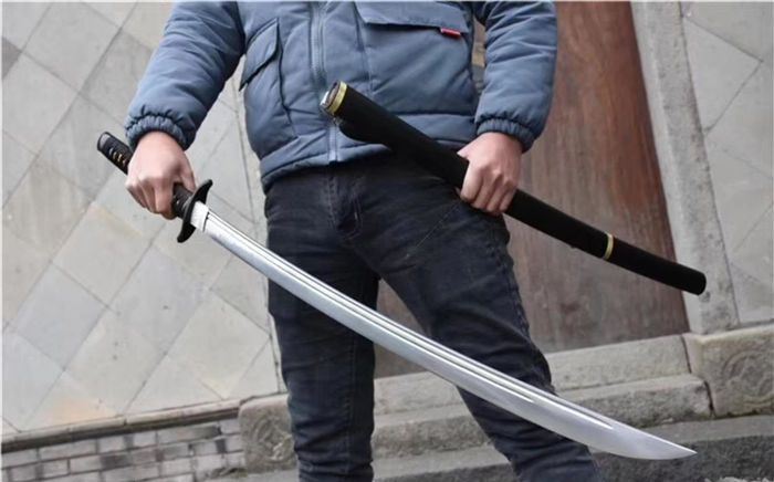 鬼武长刀 全长:104cm 刃长:73cm 柄长:27.5cm 刃宽:3.2cm 刃厚:0.6cm 净重:1.4kg 刃材:高碳钢 装具:合金 鞘材:皮木鞘 工艺:古法锻造 千锤百炼,手工研磨