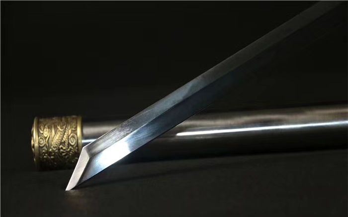 铜装龙环护手棍刀 刃材:高锰钢 总长:77cm 刃长:49.5cm 刃宽:2.2cm 柄长:23.5cm 刃厚:0.6cm 重量:1.95kg 鞘材:精钢 装具:铜 鞘直径:3.2cm 鞘壁厚:0.2cm 工艺:古法锻造,千锤百炼,手工研磨