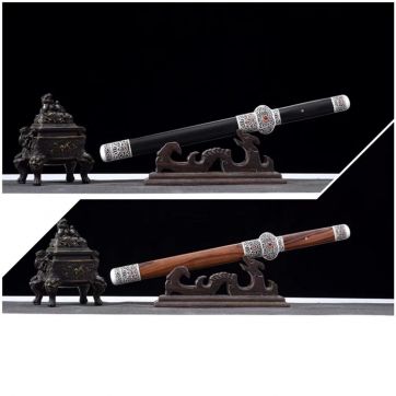 结义银兰剑 专业测试、请勿模仿 工艺:龙泉古法传统手工艺 装具:合金 刃材:T10烧刃研磨灰 柄材:乌木 酸枝木:鞘材 赠品:高端锦盒、养护油、布
