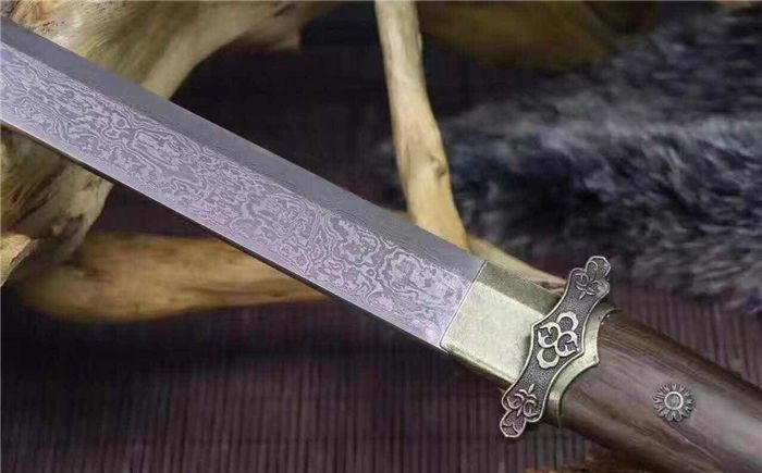 直背切刃。百炼钢手工折叠锻打,仿古装具梅花纹饰,花梨木鞘纹理细腻。 全长:79 刃长:51 刃宽:3.1 刃厚:0.7 重 :1千克, 高硬度砍铁不卷刃,送锦盒剑油