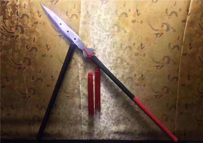 新款红缨枪 全长:190cm 刃长:45cm 柄长:70cm, 拆卸柄:70cm 最宽,:8--5.5 枪尖目测 重量2.2kg左右。 厚度 :0.6. 手柄绕防滑绳 高猛钢 可砍铁!劈柴!破甲