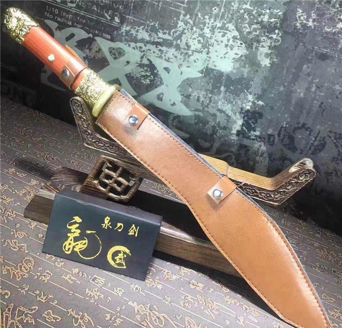全长:57cm 刃长:40cm 刃宽:5.8cm 刃厚:0.6cm 重 :1.1kg 高碳钢锻打、硬度60 合金配件、红木手柄铜钉固定送锦盒剑油