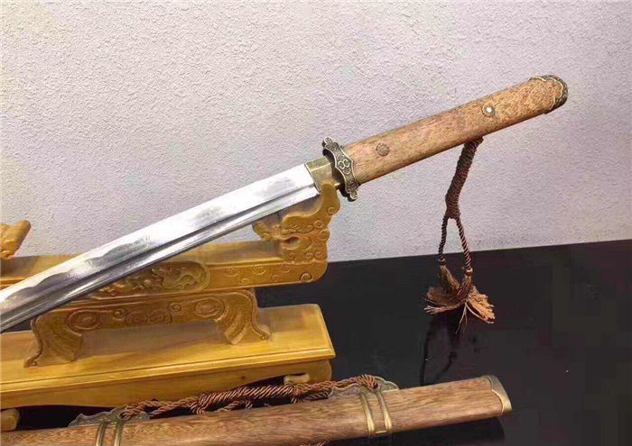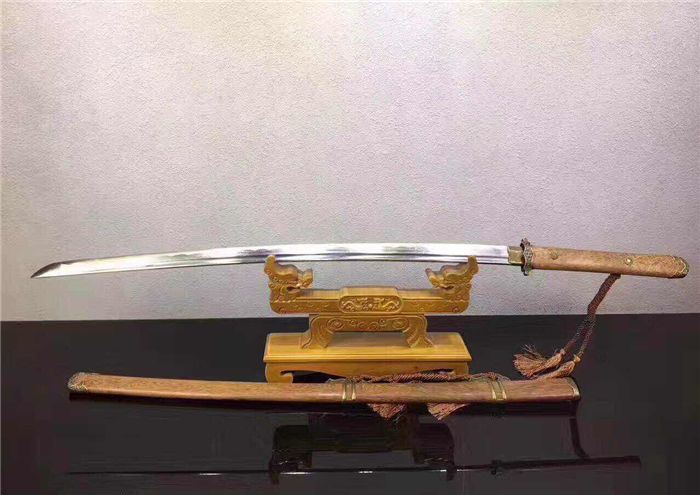素装弯刀 全长102cm 刃长72cm 柄长27cm 刃宽3.2cm 刃背厚0.7cm 刃材:中碳钢 装具:合金。 鞘材:花梨木 赠品:锦盒 剑油 适合:收藏 防身 情侣配送 乔迁送礼 武术健身 精美摆设