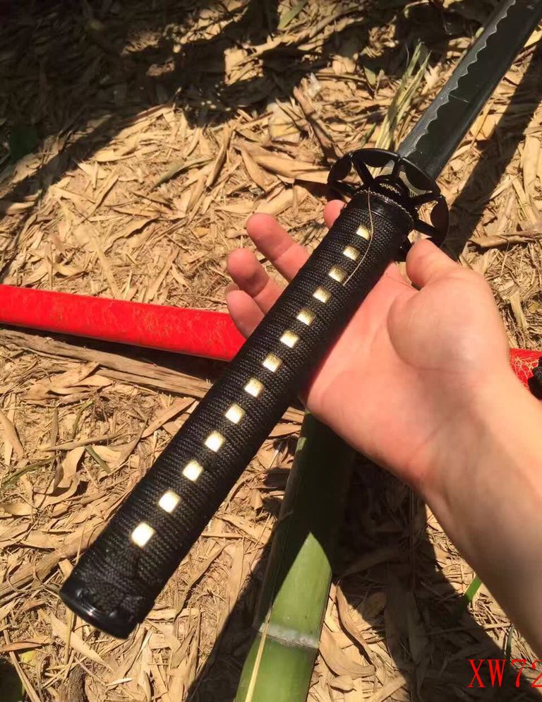 洪荒之力武士直刀26寸 全长:100 刃长:70 刃宽:3.1 刃厚:0.7 重量:1.1千克 高碳钢手工淬油锻打,纯黑装具镂空纹饰,香木鞘红亮光漆拉金丝,锋利削纸劈竹