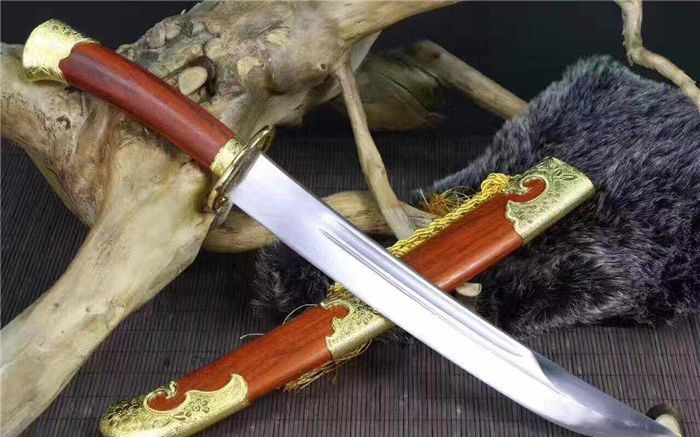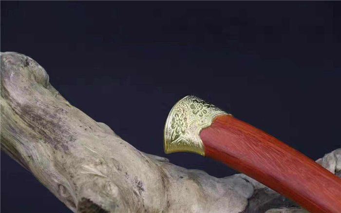 格桑清刀-12寸高锰钢仿金红木 全长:51 刃长:31 刃宽:4 刃厚:0.7 重 :0.9千克 高硬度砍铁不卷刃,锋利劈竹过水瓶,送锦盒剑油 格桑花开,策马藏疆。高锰钢手工淬油锻打,仿金装具格桑花纹饰,红木鞘奢华大方