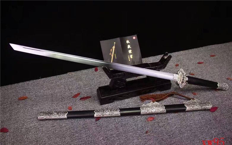 高性能豪华装唐刀 全长:103cm 刃长:72cm 柄长:27cm 刃宽:3.1cm 刃厚:0.75cm 刃材:高性能弹簧钢(弯曲90度不变形) 鞘材:乌木 装具:银装仿古 除鞘重:1.25kg 全重:1.9kg 配赠:锦盒、护油 性能:改变了传统唐刀的刃角,大大增加了唐刀的切削能力,十四道冷水磨,麻绳,草席等。
